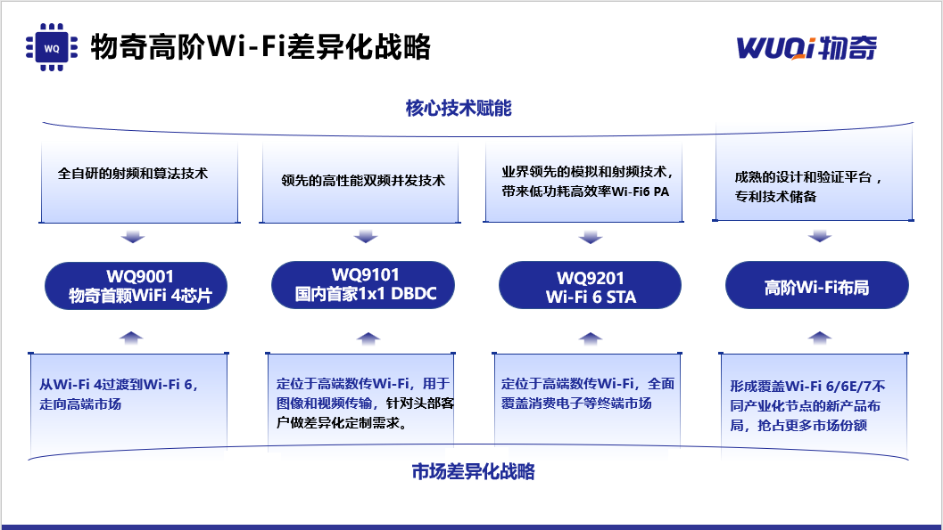 構(gòu)建于上述產(chǎn)品開發(fā)與應(yīng)用的成功基石之上,物奇在諸多關(guān)鍵技術(shù)領(lǐng)域?qū)崿F(xiàn)了市場轉(zhuǎn)化和進(jìn)階,即將推出WQ9201定位于高端數(shù)傳WiFi,全面覆蓋消費(fèi)電子等終端市場。而且,針對下一代WiFi7芯片的研發(fā)也在推進(jìn)中。