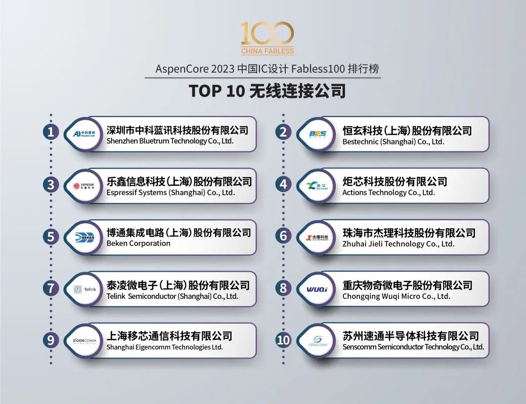 物奇作為國內(nèi)領(lǐng)先的短距通信芯片設(shè)計公司,長期深耕底層通信連接技術(shù)領(lǐng)域,憑借在低功耗設(shè)計、集成度以及通信性能等方面展現(xiàn)出的核心優(yōu)勢和巨大發(fā)展?jié)摿Γ?/span>成功入選2023中國IC設(shè)計Fabless 100排行榜之Top10無線連接公司。